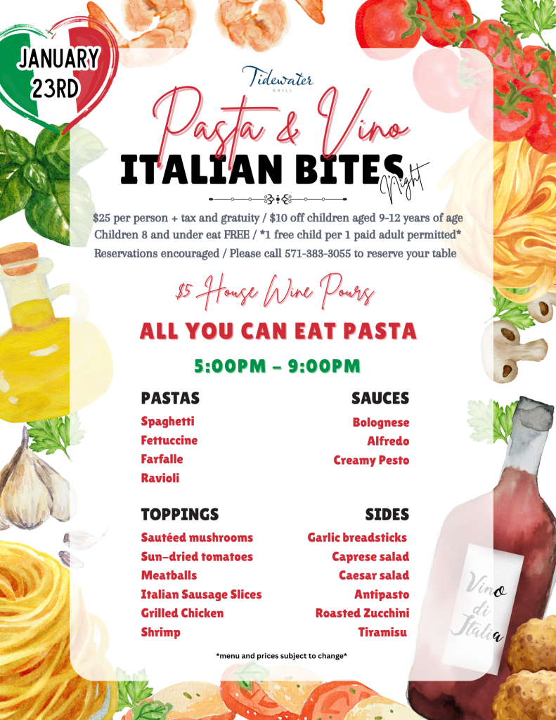 Nothing brings people together like pasta and wine so join us for Italian Night at Tidewater Grill—an all-you-can-eat Italian buffet with something for everyone, from classic spaghetti to shrimp, meatballs, and more.