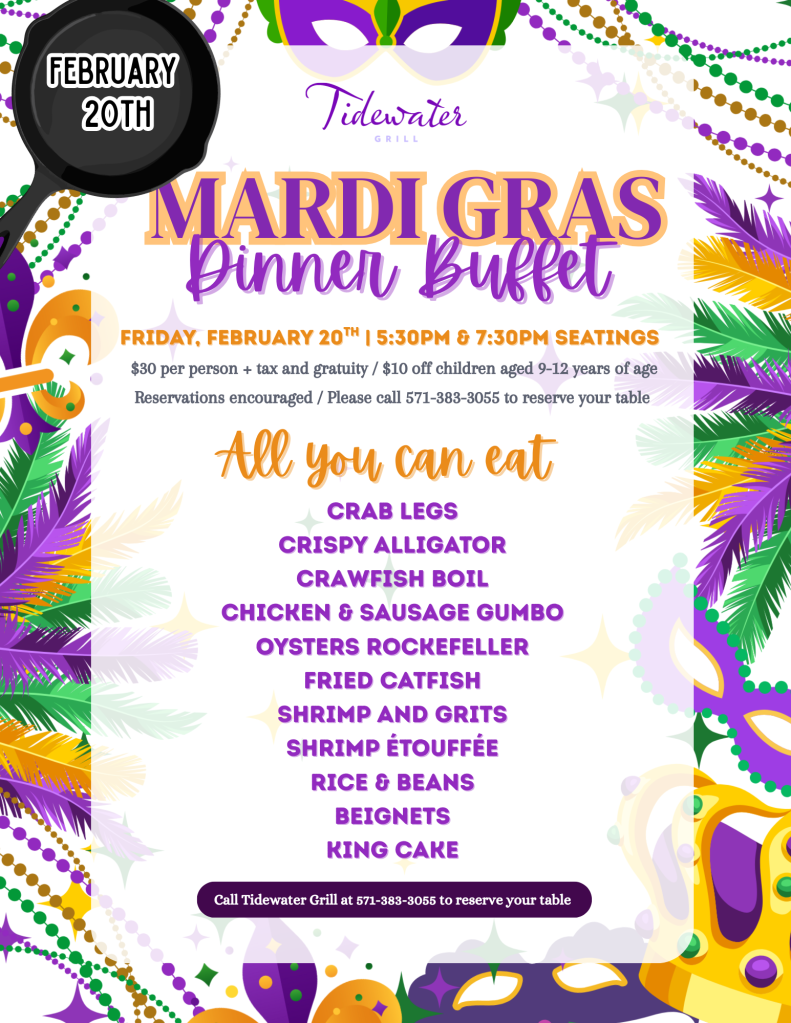 Join us for a lively Mardi Gras–inspired Friday Night Buffet and enjoy the bold, comforting flavors of New Orleans right here at Tidewater Grill. For $30 per person (plus tax and gratuity), indulge in a festive spread of Louisiana favorites in a fun, relaxed atmosphere.